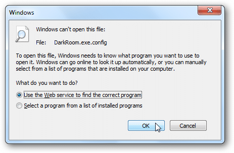 “Windows can’t open this file… To open this file, Windows needs to know what program you want to use to open it. Windows can go online to look it up automatically, or you can manually select from a list of programs that are installed on your computer.”